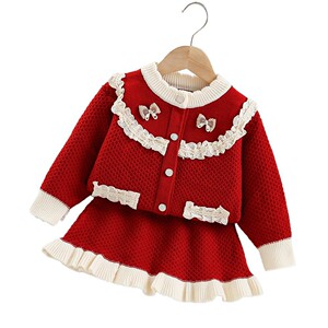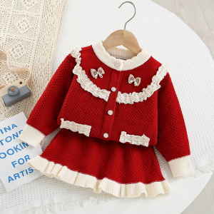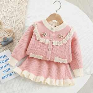 女童毛衣套装秋冬新款韩版小女孩针织开衫蕾丝边长袖毛线裙两件套