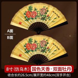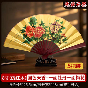 【ダンス扇子は落ちにくい】8inch模造マホガニー - 牡丹の面と梅の花の面[国家の色と天の香り]