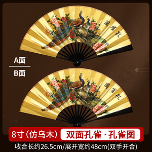 【破れにくい絹扇子】8inch模造マホガニー両面孔雀風【孔雀絵】