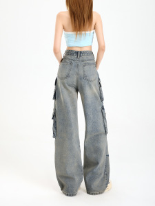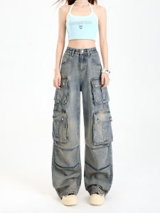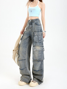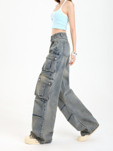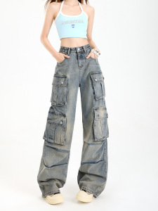 女性用サマーマルチポケットワークジーンズ、アメリカンストリートデザイン、ヘビーデューティーハイウエスト、レイジースタイルストレートワイドレッグパンツ