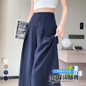 ダークブルーリネンワイドレッグレディースパンツ薄い夏ルーズカジュアルドレープハイウエストフロアレングスコットンとリネンストレートロングパンツ