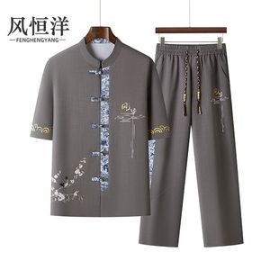 中国風紳士服新中国風漢服スーツメンズ半袖ズボン唐装夏薄手カーディガン刺繍ツーピースセット