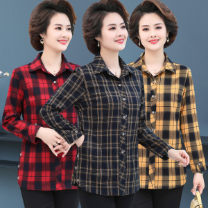 綿チェック柄シャツレディース長袖ママ秋新作トップジャケット春秋中高年カジュアル綿シャツ