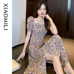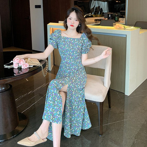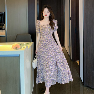 法式方领泡泡袖碎花连衣裙女夏季气质名媛高级感雪纺收腰开叉长裙