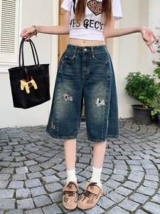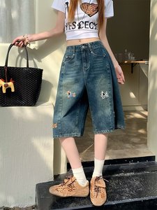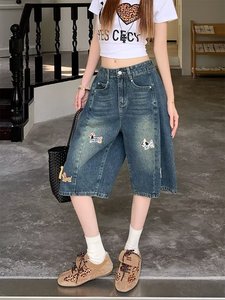 アメリカンレトロデザイン刺繍入り女性用デニムショートパンツ夏ルーズワイドレッグストレートパンツ小柄な人向け