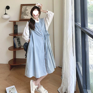 大码胖mm韩系连衣裙女春秋叠穿清新条纹背心裙衬衫裙两件套200斤
