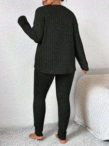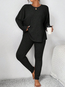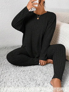 2025年秋冬向け、無地の丸首長袖リブ編みトップスとファッショナブルなカジュアルパンツのツーピースセット(特大)