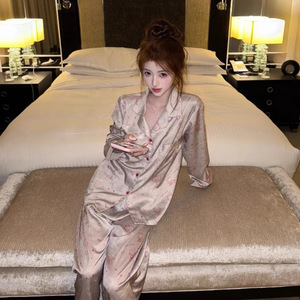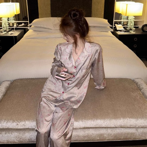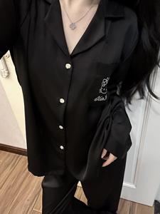 轻奢缎面冰丝睡衣女款夏款高级缎面长袖长裤家居服Kitty印花套装