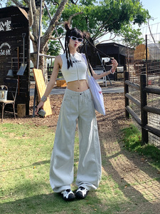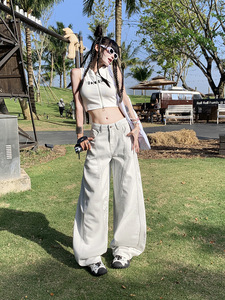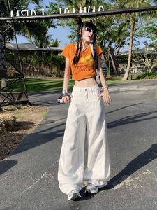莱赛尔天丝阔腿弯刀牛仔裤女夏秋新款宽松显瘦直筒裤子