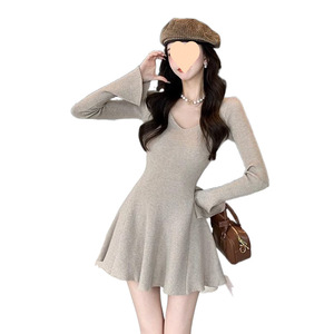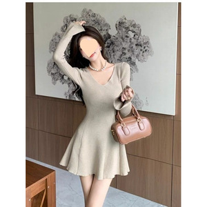 法式浅杏色喇叭袖领连衣裙长袖内搭收腰早春季富家千金修身短裙~