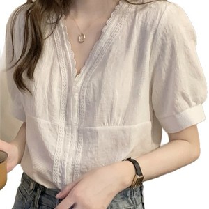 2025年夏の新しいVネックレースパフスリーブ白シャツデザインニッチライト大人半袖シャツトップス女性用