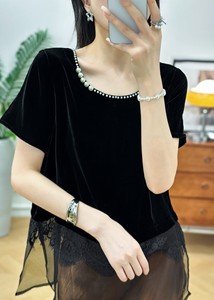25夏フレンチハイソリッドカラーシルクベルベット手作りビーズ裾とシルクコーガンガーゼサイドスリットトップ
