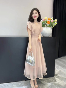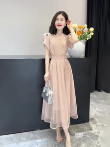 2025 夏の新スタイルライト高級ハイエンドロングスカート気質社交界ライトピンク半袖シフォンドレス婦人服