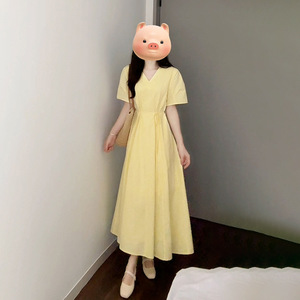 茶歇法式黄色连衣裙子女夏季2025新款海边度假高级感收腰气质长裙