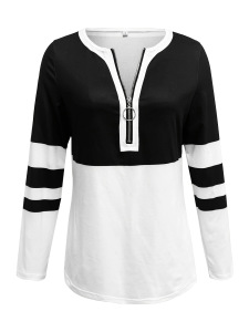 欧米越境貿易婦人服アマゾン秋冬Vネック配色ストライプゆったりジッパー長袖Tシャツセーター