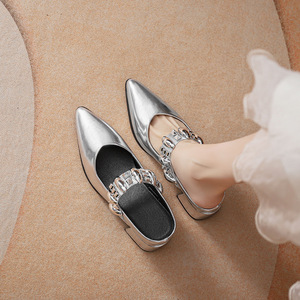 8cm インチアップレディーストゥキャップシューズ韓国風フレンチポインテッドトゥハーフスリップスモールハイヒールメリージェーンシルバーシューズ