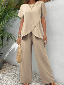 Amazon 2025 ヨーロッパとアメリカの女性のカジュアルクロスオーバー大きいサイズ不規則なトップサマースーツワイドレッグパンツ 2 点セット