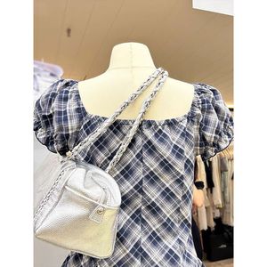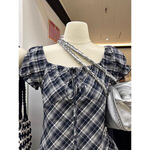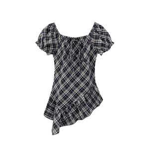 大きいサイズフレンチレトロ不規則なフリルパフスリーブトップ夏の新しいスリムチェック柄トップ