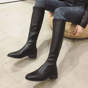 女性用ロングブーツ、膝丈以下、COS秋冬韓国版、万能スクエアトゥストレッチハイブーツ、ストレートスリムロングライダーブーツ