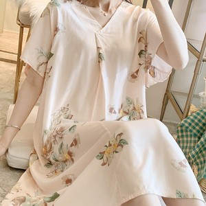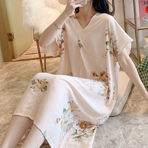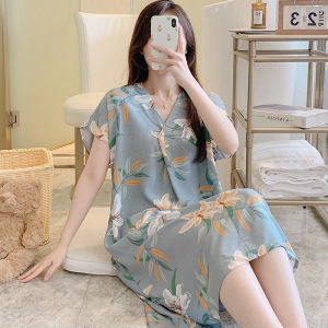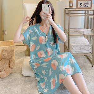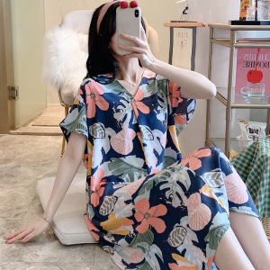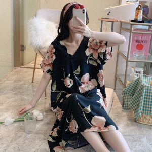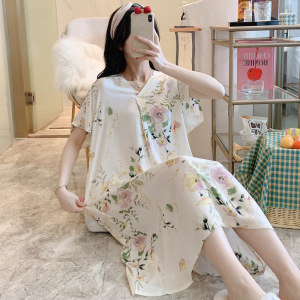 Vネックの女性用の小さな新鮮な綿シルクパジャマ、夏の薄い人工綿の太ったMMホームスカート、気質は綿シルクのナイトガウンの外で着用できます