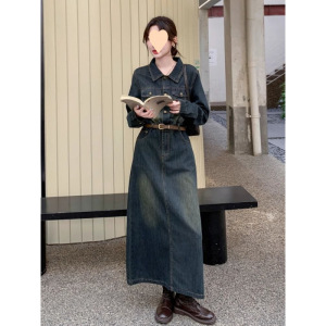 2025新款时尚休闲复古色中长款牛仔连衣裙女春秋款收腰显瘦长裙子