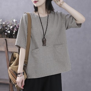 レトロな女性用ミッドスリーブボトリングシャツ、夏用薄手トップス、スタイリッシュなスモールシャツ、プルオーバー、ルーズストライプ、五分袖、五分袖Tシャツ