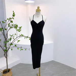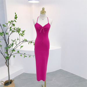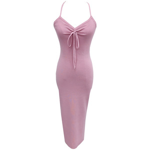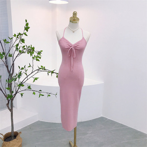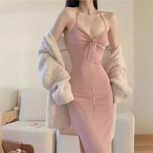6838 密着ストレッチホルターネックベストドレス V ネックプリーツレースアップウエストバックレススリットインナーサスペンダースカート