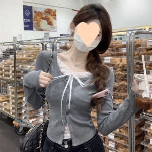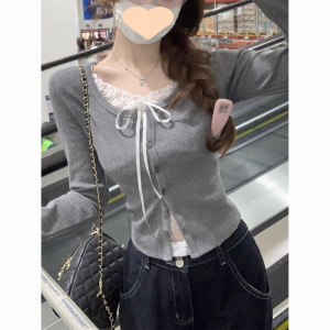 春の女性の新しい多用途痩身レースアップ長袖ブレストセーター純粋な欲望レースフェイクツーピースニットカーディガン