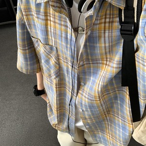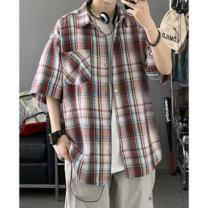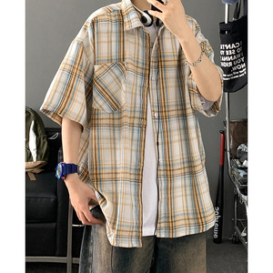 チェック柄シャツメンズ夏薄い半袖カジュアルルーズジャケット 2025 新しいアメリカンレトロトレンディシャツ