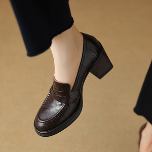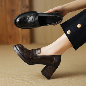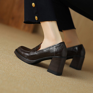 增高8cm~通勤复古高跟鞋女黑色一脚蹬乐福鞋女生简约英伦风小皮鞋