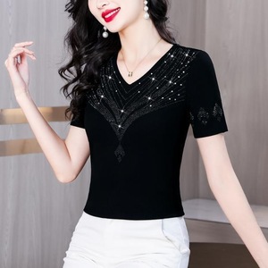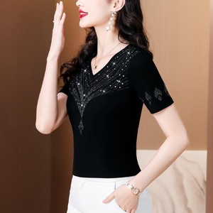 2025年夏の新しいファッショナブルなスタイルのホットダイヤモンド半袖Tシャツ、女性用、ファッショナブルで年齢を軽減する、スリムで多用途な女性用トップス