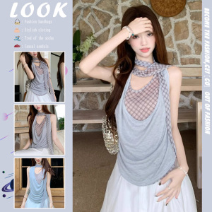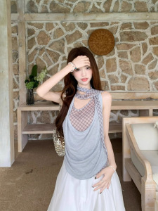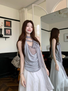 フェイクツーピースブルーチェック柄スイングカラーレディースTシャツ夏ノースリーブデザインニッチユニークでシックなオフショルダートップ