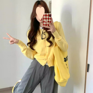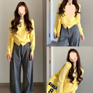 春季慵懒针织假两件开衫女多巴胺新款毛衣外套长袖打底衫黄色上衣