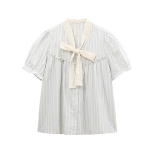リボンシックなレースパフスリーブストライプシャツ女性のための夏の 2025 新しいカジュアル甘い優しいスタイルトップ