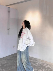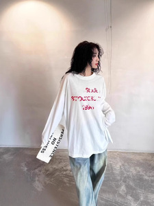 2025新款简约红字母宽松T恤百搭显瘦长袖慵懒风T恤男女同款中长款