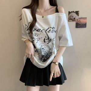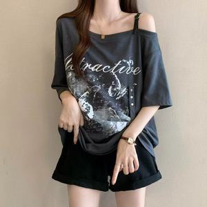 大きいサイズのアメリカンオフショルダー右肩半袖Tシャツ女性用2025年夏新作ファットmmルーズカバー肉とお腹トップ