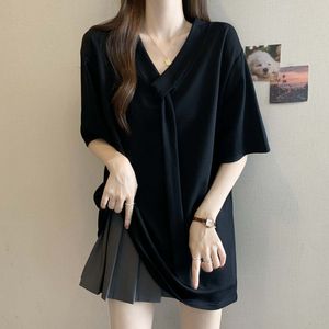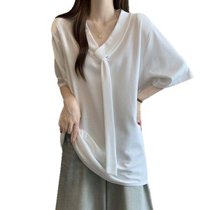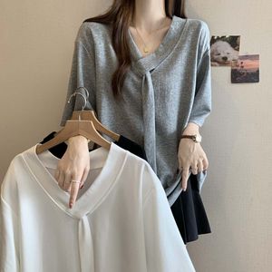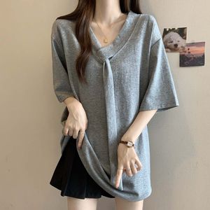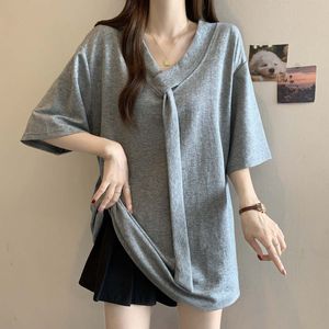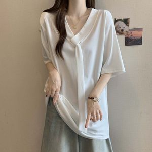 大きいサイズのデザインネクタイ V ネック半袖 T シャツ女性のための夏 2025 新しいルーズ痩身カバーファッショナブルなトップス女性のための