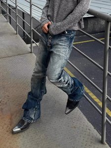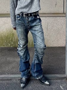 クロスボーダーアメリカンレトロウォッシュリップルマイクロフレアジーンズメンズ新しいホットガールブレストプリーツストレートスリムパンツ