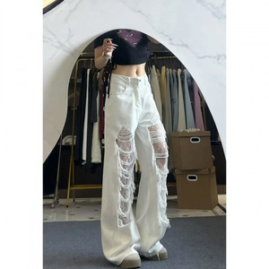 夏季白色牛仔裤破洞筒裤宽松设计蕾丝镂空拼接显瘦百搭洋气阔腿裤