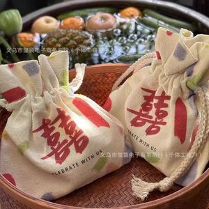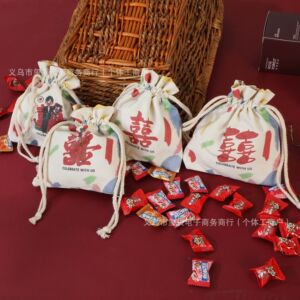 落書き風お菓子箱、喜字入りお菓子袋、折りたたみ不要の記念品キャンバス製ハンドバッグ、結婚式のギフト包装袋