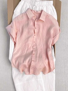 フレンチスタイル年齢軽減ピンクラミーリネン半袖シャツ女性のための夏の2025新しいレイジースタイルカジュアルスリムトップ