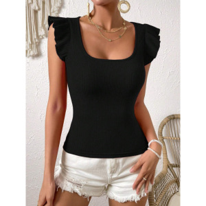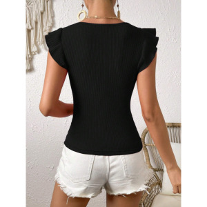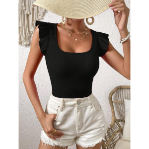 ヨーロッパとアメリカのフリル春夏エレガントな痩身Tシャツ新しいニットリブ生地