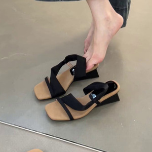 シープスキンバージョン~ウェッジヒールフレンチスタイルスクエアトゥサンダルレディースワンラインストラップスリッパオープントゥスカート付きハイヒールサンダル