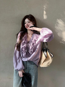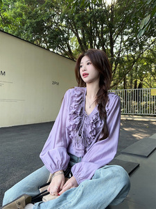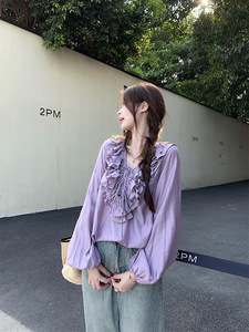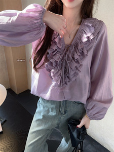 2025 ユニークでシックな多用途シフォンシャツフレンチニッチ気質フリルパープルシャツトップ女性の夏