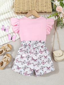 クロスボーダーイン幼児女の子夏の花蝶レーススリーブトップリボンショーツセット