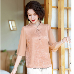 エレガントで多用途なママ服夏の新しいスタンドカラーシャツレディースファッショナブルなスプライシングミッドスリーブトップスリムTシャツ