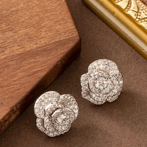 Amazonクロスボーダーファッション絶妙なフルダイヤモンドジルコンフラワーイヤリング女性用、ハイエンド、気質、小さな新鮮なシルバーニードルイヤリング