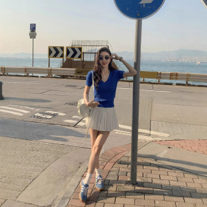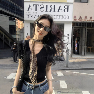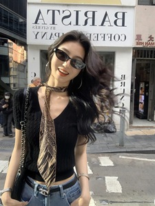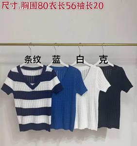 ストライプ V ネックプルオーバートップ半袖女性の夏のレトロツイストスリムトップ