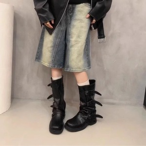 牛革バージョン!黒のパンツブーツ、ヨーロッパとアメリカのストリートスタイル、ラウンドトゥ、太いヒール、ベルトバックル、膝上プリーツハイライダーブーツ