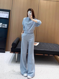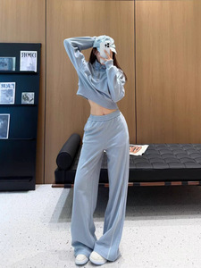 スタンドカラーのショートスウェットシャツとウエストゴムのストレートパンツのセット